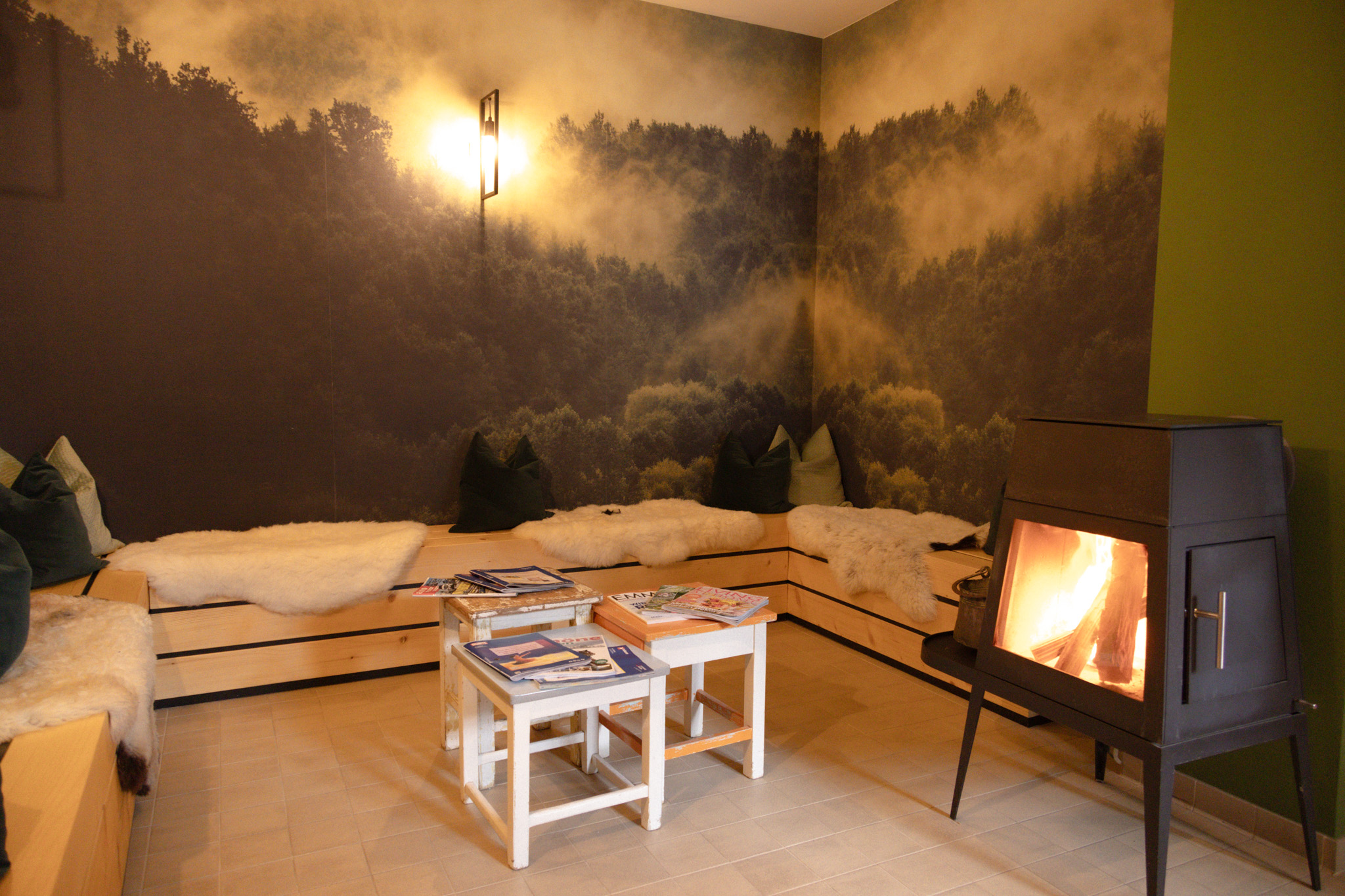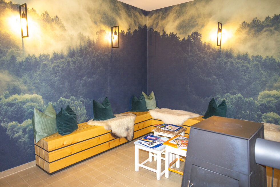 Für Hotelgäste kostenlos: der Wellness- und Spa-Bereich auf zwei Ebenen und 180 m² mit Sauna, Dampfbad, Erlebnisdusche, Massagen und zehn Ruheliegen. Von der oberen Ebene führt eine Tür auf die Sonnenterrasse mit Blick auf die Berge – nach einem Tag draußen genau das Richtige.